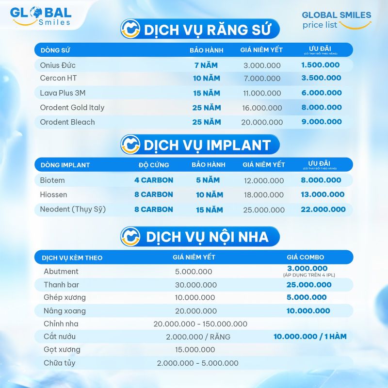 Tính minh bạch về chi phí là yếu tố quan trọng để xây dựng lòng tin. Dưới đây là khung bảng giá tham khảo các dịch vụ chính tại Nha Khoa Global Smiles.